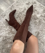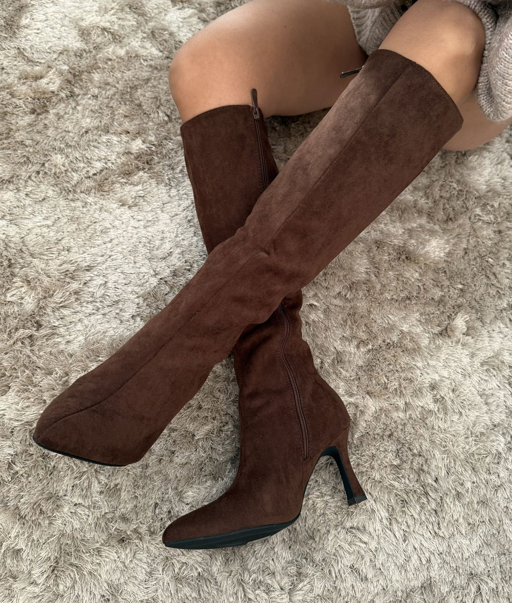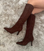 Botas altas de ante marron chocolate. El tacón mide 8,5 cm.
