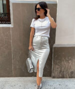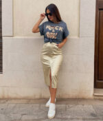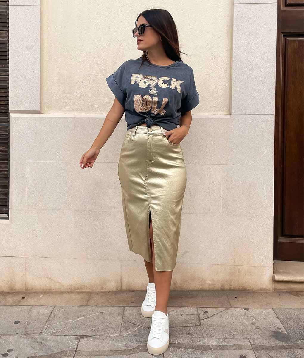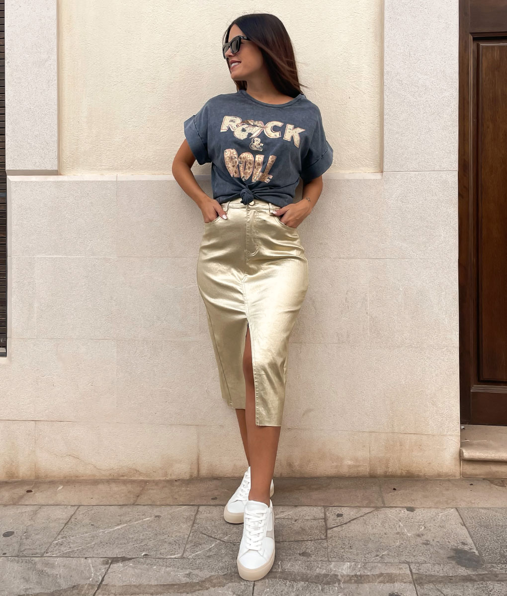 Etiquetas: Falda, falda dorada, falda metalizada, falda midi, falda plateada