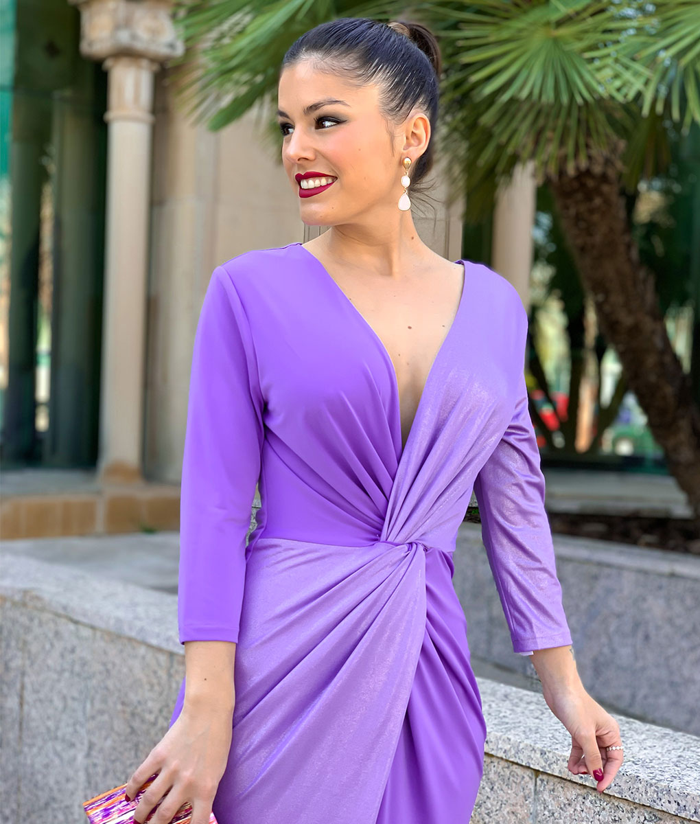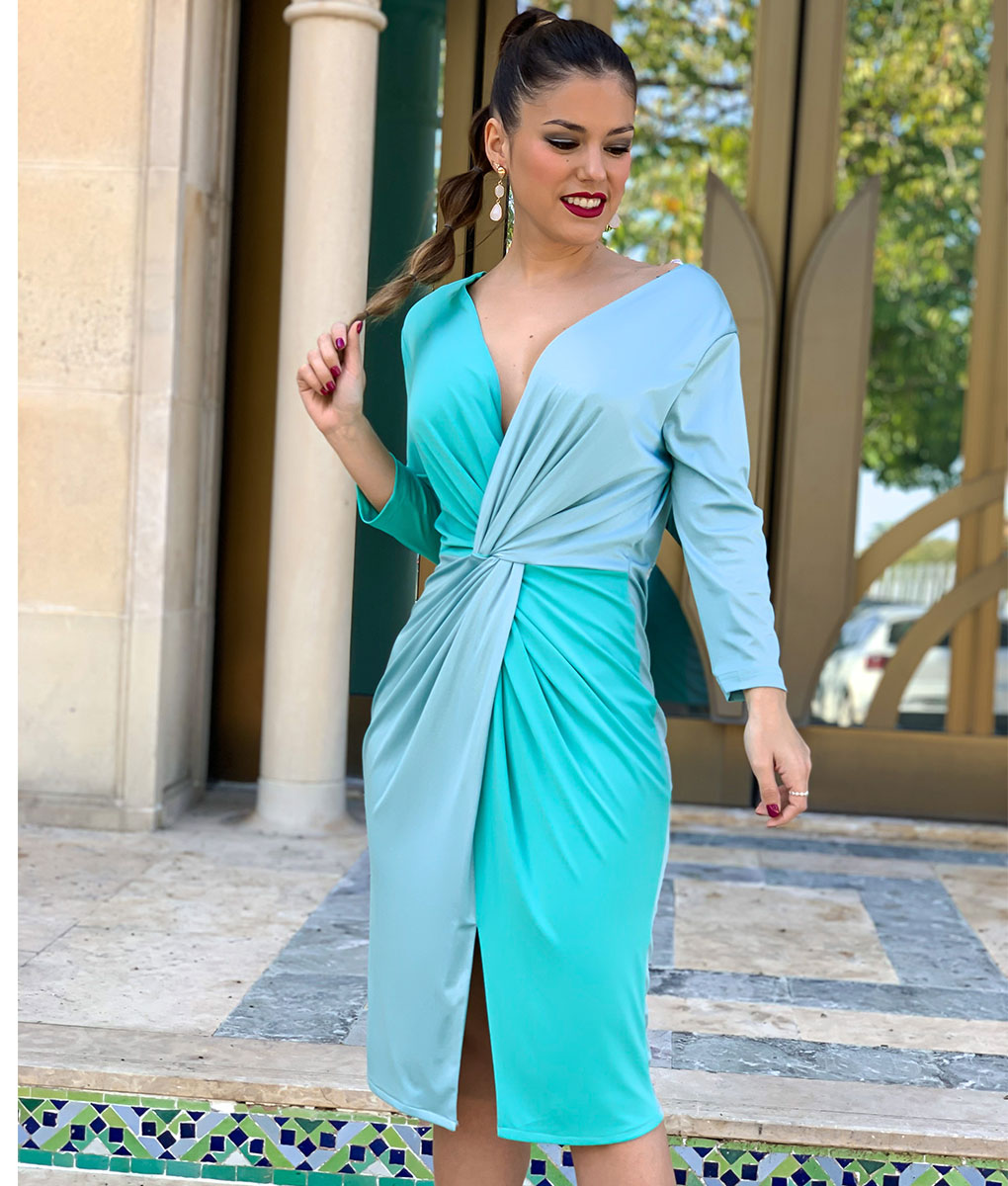 Vestido confeccionado en punto de seda. Lleva cruce en la cintura con frunces que hacen efecto reductor.